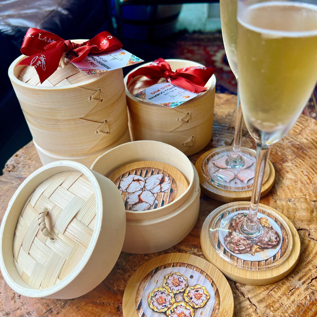 Set of 4 Bamboo Coasters housed in a Bamboo Steamer, featuring Alvin's hand-painted watercolor illustrations of four beloved dim sum classics. This charming and durable coaster set is crafted from bamboo ā an earth-friendly and renewable resource with a beautiful, natural wood grain finish. A one-of-a-kind, premium offering designed and crafted with love, perfect for all dim sum enthusiasts and occasions.